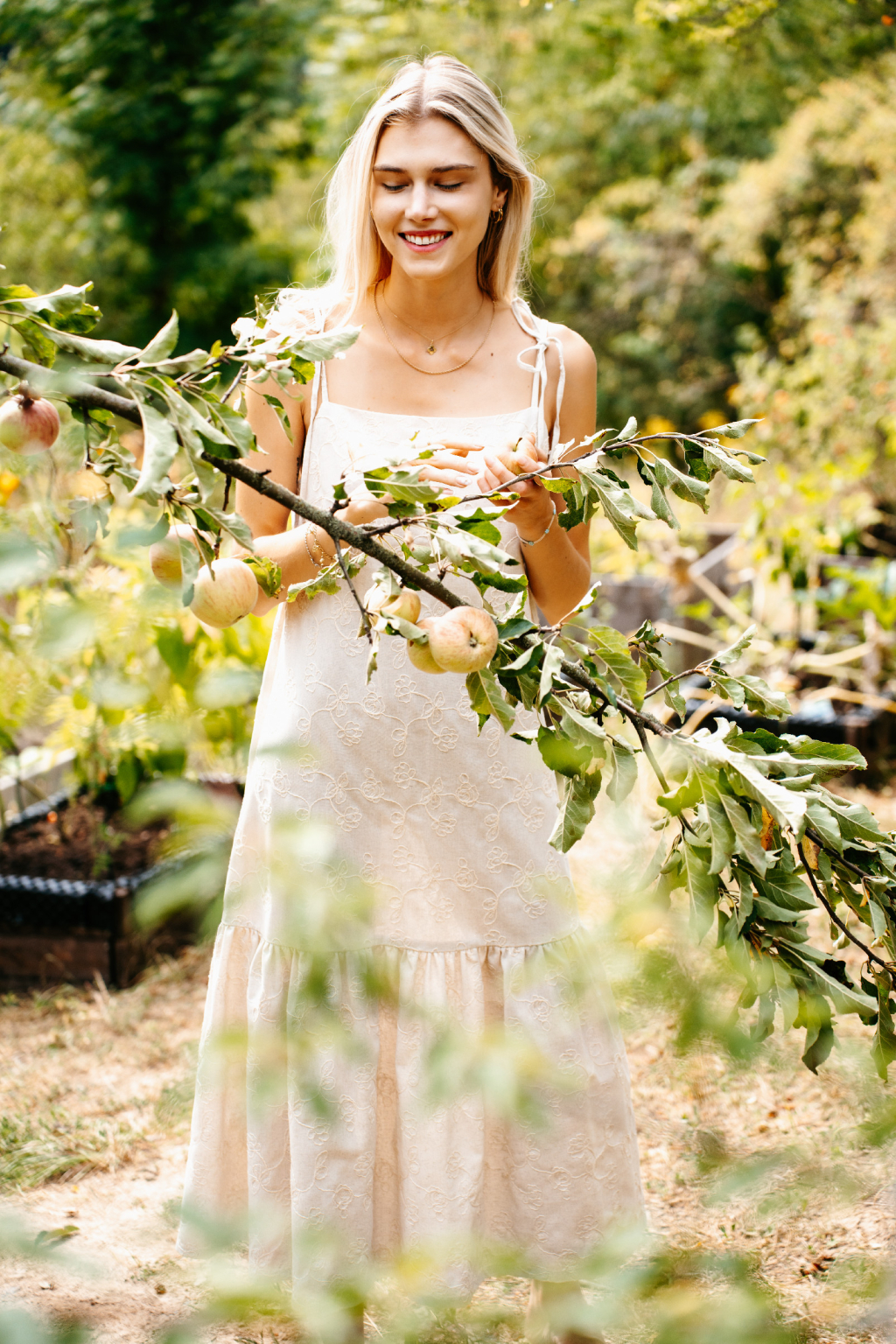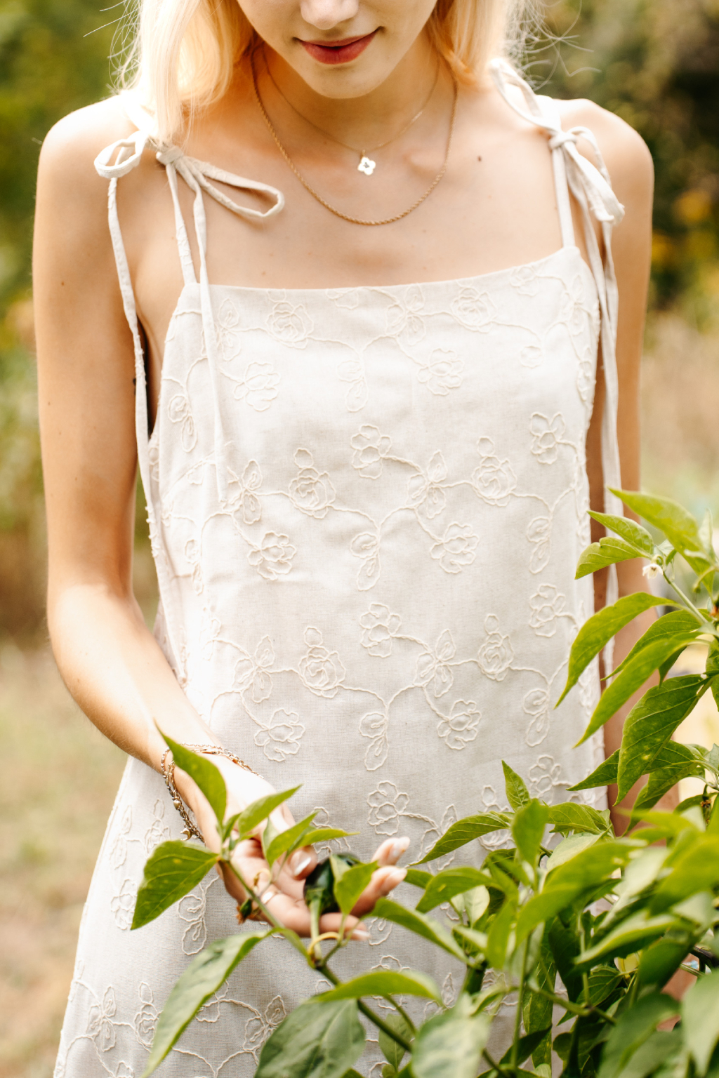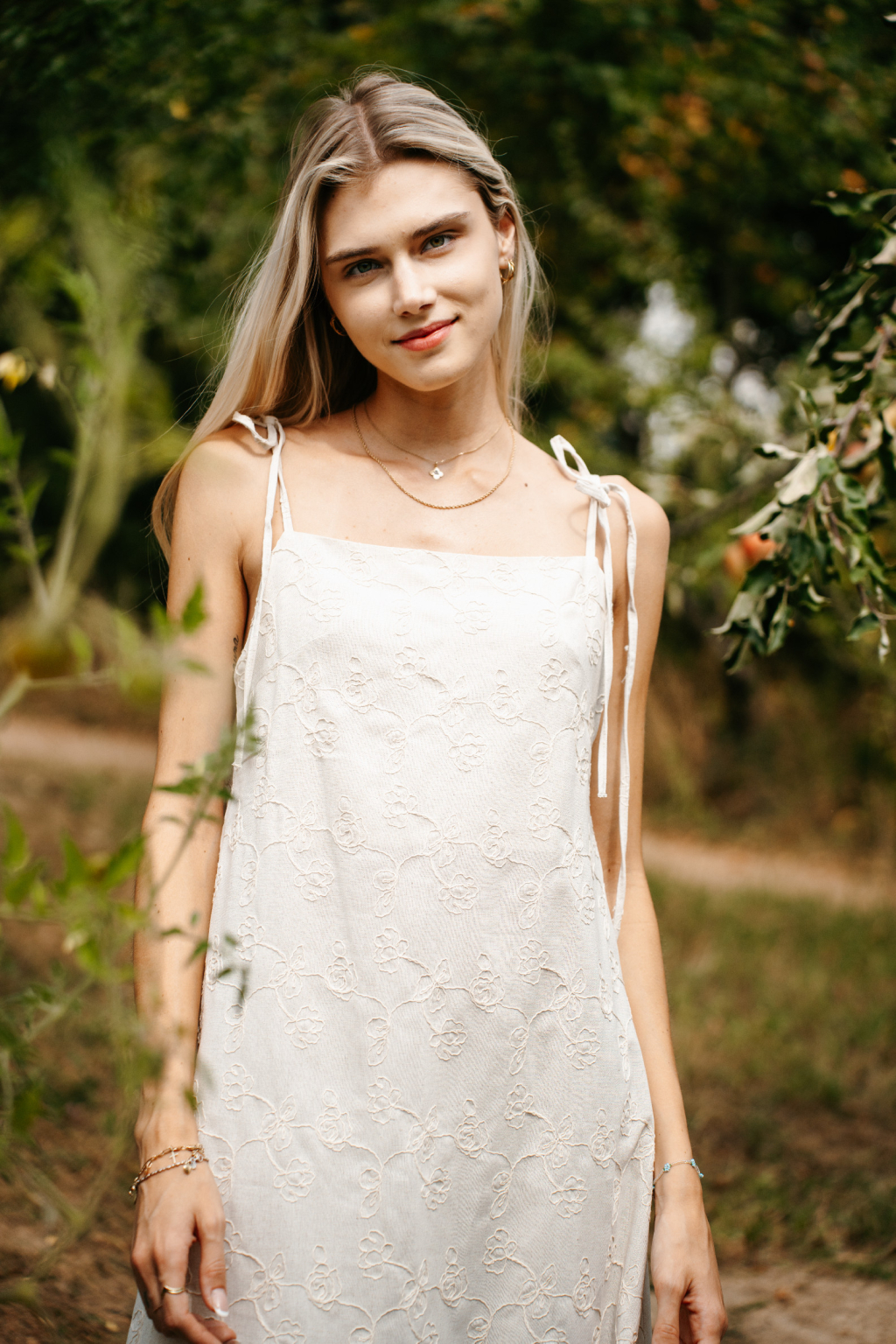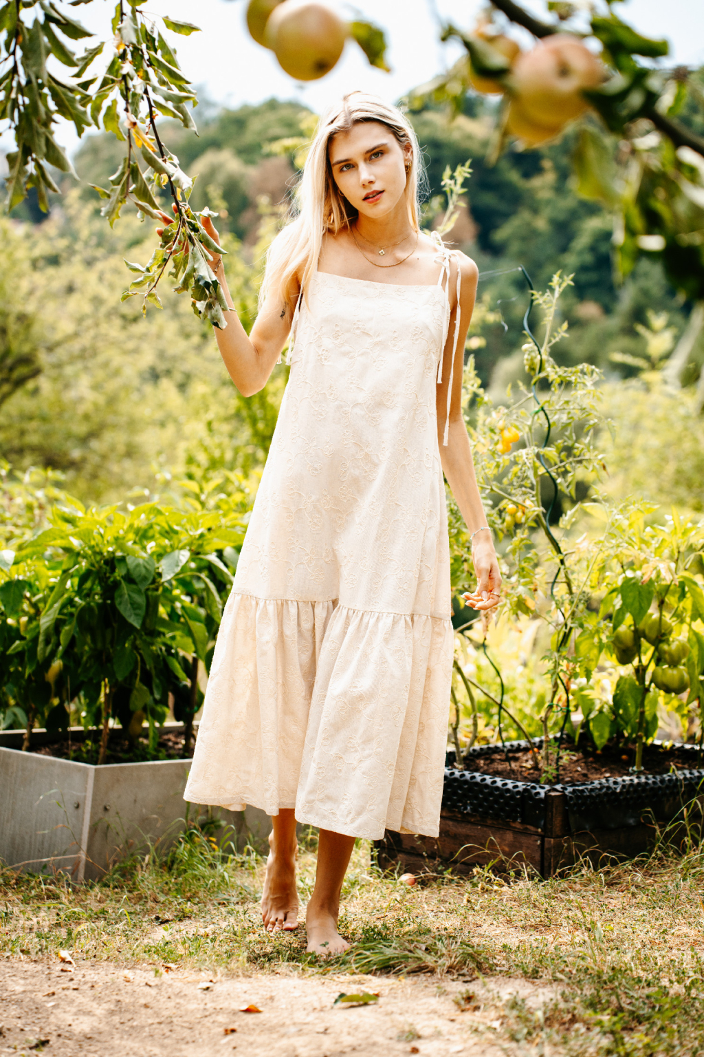 Poslední letošní novinkou jsou tyto dlouhé letní šaty s jemnou květinovou výšivkou a volným střihem pro lehkost pohybu. Navržené pro dny, kdy nechcete nic řešit. Jen se nadechnout a být.