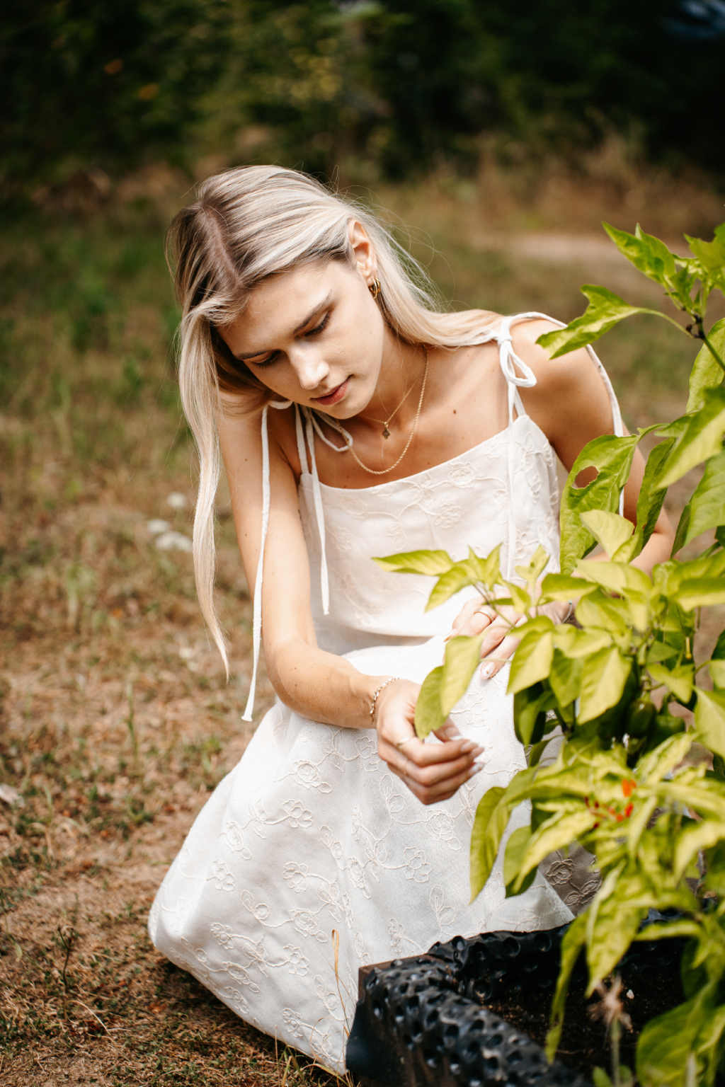 Ušité z přírodního deadstock materiálu ze směsi bavlny a lnu, kterému jsme u nás v ateliéru dali druhý život. Látka je pevná, ale vzdušná. Díky přírodnímu složení krásně dýchá a výšivka v tónu látky jí dodává jemný rustikální nádech. Volné spodní nabírání je nejen ozdobou, ale i symbolem svobody, ženskosti a pohybu.