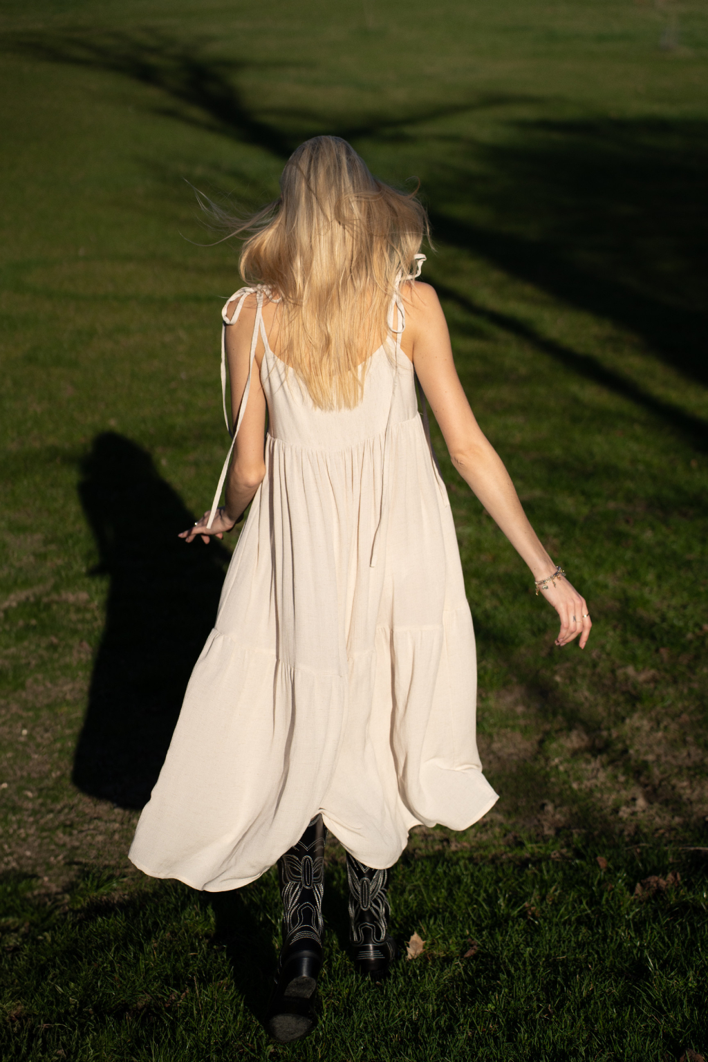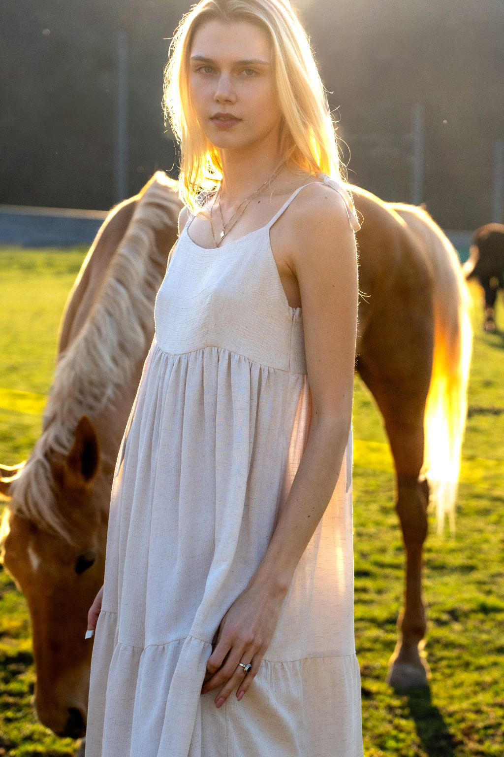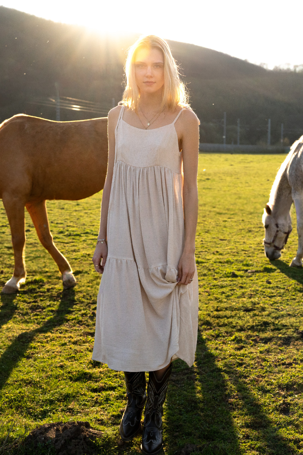 Lehké jako letní večer, volné jako nedělní odpoledne. Tyto dlouhé šaty na ramínka jsou ztělesněním klidu a přirozené krásy. Jsou ušité ze směsi viskózy a lnu, kombinace, která krásně splývá, příjemně chladí a zároveň si uchovává lehce rustikální strukturu. Dokonalé pro tropické letní dny!