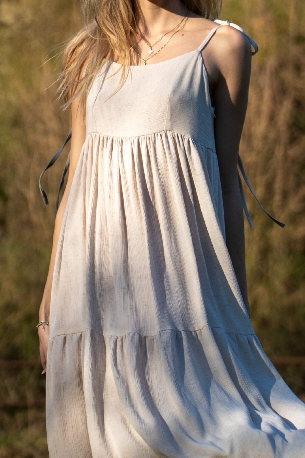 Vzdušné letní šaty ze směsi přírodních materiálů. Eticky vyrobené v České republice s důrazem na udržitelnost.