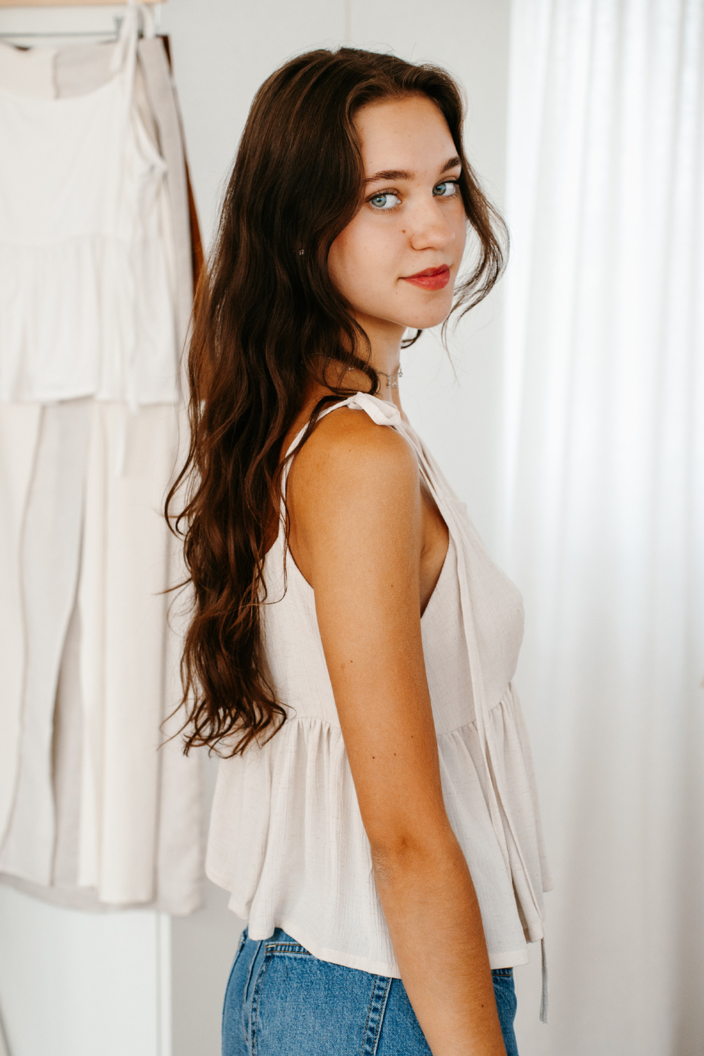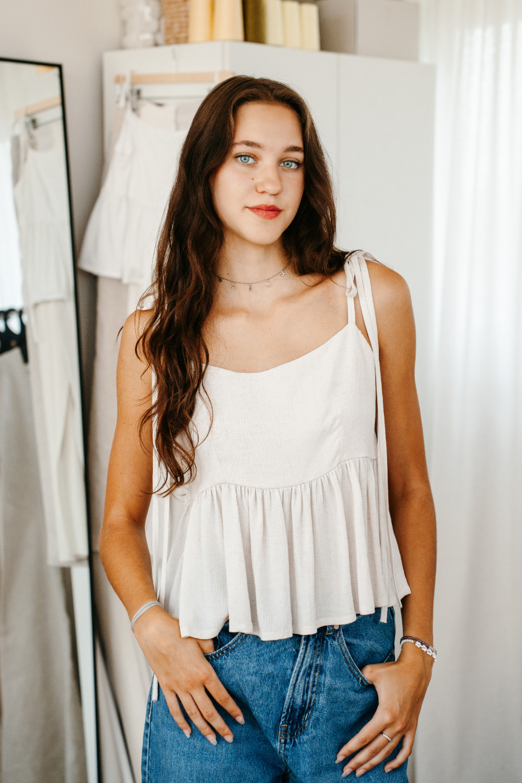 Tento letní top s jemným nabíráním a ramínky na zavazování je přesně tím Kouskem, který vám zpříjemní každý teplý den. Lehký a prodyšný materiál ze směsi viskózy a lnu se krásně přizpůsobí pohybu a dopřeje vám pohodlí i v horkém počasí. A díky variabilnímu zavazování ramínek si ho snadno přizpůsobíte své postavě.